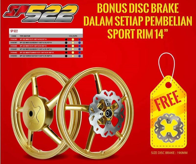 Untuk sport rim 14 SP522 type motornya adalah ; Mio 110 (F-18514 R-21514), Mio 125 Xeon (F-18514 R-21514), Mio 110 (F-14014 R-1604), Mio 125 Xeon (F-14014 R-16014), Beat/vario 110 (F-14014 R-16014), dan Vario 125 /150 (F-14014 R1-6014).