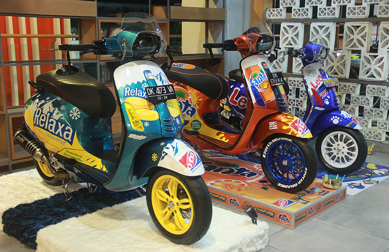 Beneran unik, di zona parkir Vespa Rookies, nampak beberapa maskot Vespa yang tampil unik bareng konsep modif sederhana tanpa sokongan ragam part aftermarket berbanderol selangit, namun begitu good looking kala dikonsep segar berbase coat fresh look berikut sajian unggahan tema-tema minuman unik hasil olah kreasi stricker. Tak kalah seru, di jajaran zona parkir Maxi Treck Look, kali ini makin menyajikan ragam keseruan tema finishing racing yang dituangkan di kanvas body semi telanjang ala Maxi pembalap jalanan khas Bali ini.