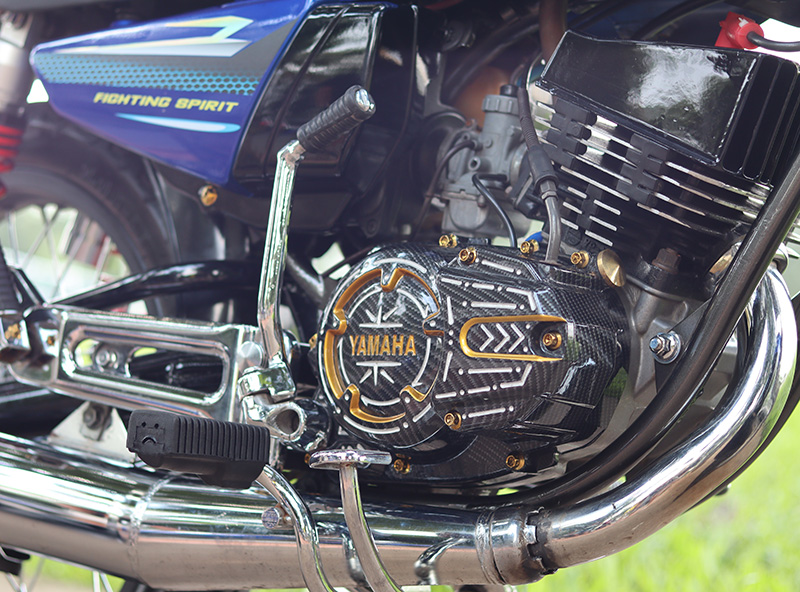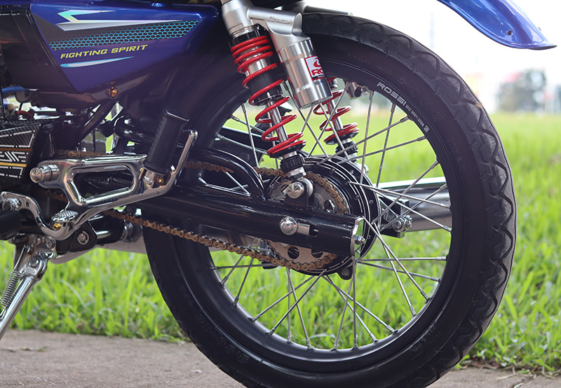 Kedua lingkar penggerus aspalnya kini diracik makin meracing bareng pasangan pelek almu yang digaet set tromol bersentuhan customisasi via aksi bubut milling ala tromol balap gajah putih style. Makin keren, swing armnya mengadopsi swing arm custom oval dengan pemanis upper stabilizer yang dipilari sepasang sok buritan tabung berlabel RCB negeri Jiran.