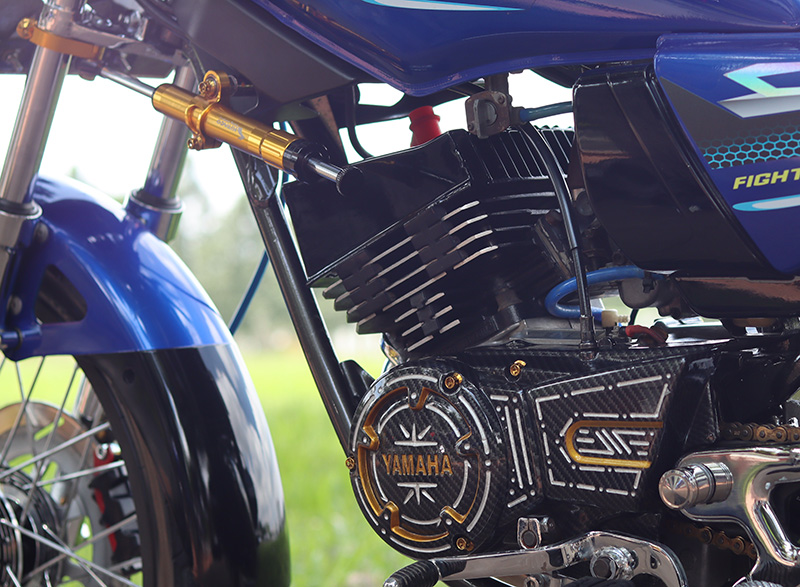 Mengimbanginya, lingkar kaki depan kini dikawal caliper cakram 4 piston yang juga menggaet produk RCB lengkap dengan master yang kini menancap di sebilah setang cangkokan New V-Ixion. “Aku juga menginstal stabilizer stang berkonstruksi konvensional tepat di bawah empang Pertamax sisi kiri,” bisik Bobit yang juga menampilkan sporty area dapur pacunya bareng pelapisan karbon laminasi di kedua sisi engine calternya.
