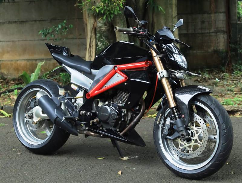 SOK DEPAN : Up side down GSX1000, PELEK DEPAN : 3,5 inch GSX 1000, PELEK BELAKANG : 6 inch Honda CBR 1000RR, BAN DEPAN : Pirelli 120/70, BAN BELAKANG : Dunlop 190/50, REM DEPAN / KALIPER : Tokico 8 piston GSX 1000, SELANG REM : Yamaha R1, MASTER REM : Brembo Aprilia RSV1000, MASTER KOPLING HIDROLIS : Brembo Ducati 1199s, SWINGARM & MONOSOK : CBR1000RR, BODYSET : Custom, KNALPOT : Yamaha MT25, BENGKEL CUSTOM : Cuy Modification - Tapos Depok Jawa Barat CP : 0822-3343-1816.