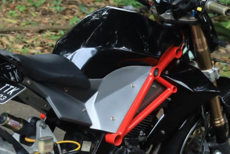 Aplikasi bodycustomnya sendiri dipanteng mulai dari depan hingga buritan, dengan lekukan garis body yang lebih tegas. Agar terkesan garang, punuk tangki dibuat lebih tinggi, plus shroud minimalis namun presisi. Sedangkan ekor juga diseting tinggi, tanpa boncenger. Kesan agresif, juga terpampang dari riding positionnya. "Rangka utamanya sih masih ada, tapi yang belakang potong abis. Dan ditambah trellis," tukas Yanto, sapaan akrabnya.