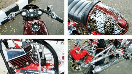 “Memang jarang dipakai jalan, khusus untuk display di gerai saja sekaligus untuk ikuti ajang pameran motor, “ jelas Pria asal Magelang ini. Sekilas, garapan retro bike ini memang spesial, dengan sentuhan detail yang sempurna. Konsep bodi berbahan plat sangat kental bernuansa caferace berikut buritan semok ala buntut tawon, dan disembur kombinasi cat kilap bergrafis batik. Tidak lupa nomer keberuntungan “16” yang disakralkan modifikator pendiam ini.