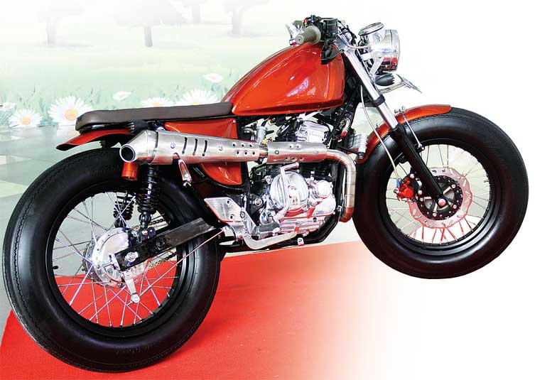 “Dukung aksen muscle, swing arm orsi kugusur swing arm Tiger demi memancang sepasang ilar sok buritan tabung gasnya,” tunjuk penginstal fork eks. Byson bersetang beach bar dan head lamp CB250 krom ini.