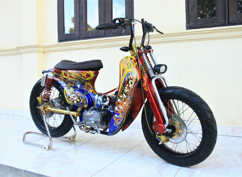 Sementara, body-nya sendiri disembur ulang dengan airbrush, dasaran dua warna dengan grafis klasik bermotif floral. berbahan cat Penta dengan warna merah, biru serta goresan kuning yang kontras diakhiri clear spieshecker. Totalitas airbrush ini juga ditimpakan ke semua part, termasuk tebeng depan. Overall, tampilannya pun kian khas dan terlihat mencolok, berkat kombinasi gaya street-cub dan finishing airbrushnya yang mantab. Keren !