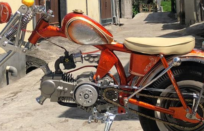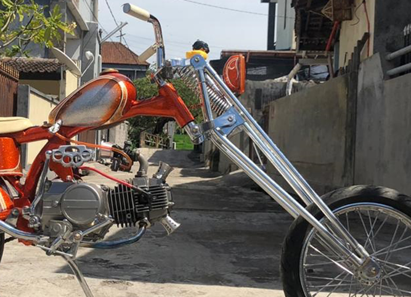 Keseluruhan frame dan body ini sontak digebyur painting retro soul berbase coat glitter kombinasi candy gradasi orens dan silver berlis striping gold leaf. “Mendukung tongkrongan mewah, set fork, setang, free flow exhaust dan back rest berikut sissy barnya kucelup krom,” pungkas Putu darmadi. Tito Monster 5%