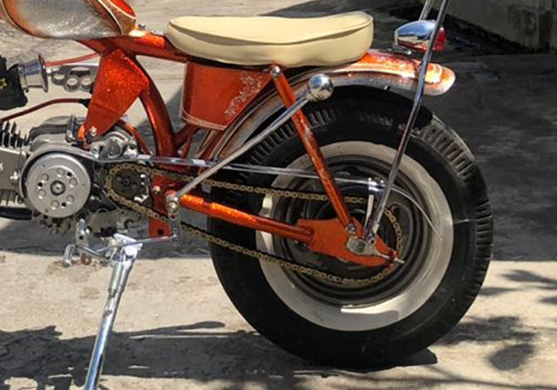 Untuk under carriage, Nicko mengandalkan pasangan lingkar kaki imut, “Untuk depan cukup mengandalkan selingkar pelek eks. Mio 14 inch yang dipancangi tromol handmade mini. Lantas lingkar buritannya kubikin dari limbah pelek Kymco Easy 10 inch yang kuimbuhi braket sprocket dan kukawinkan selingkar karet ban kembang klasik jarahan ban Suzuki ST 20 profil 5.00-10 berlis white wall,” papar Nicko XPC yang mengantongi CP 081246967609.