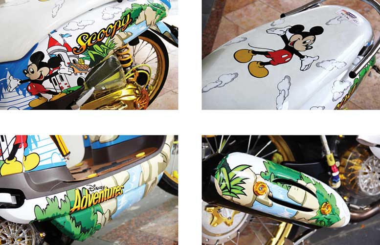 Warna dasar wrappingnya mengusung kelir biru putih, yang lantas diolah unik dengan back ground istana Disneyland. Lantas di setiap permukaan bidang main body-nya, sosok Mickey diungah bareng beragam pose, tak terkecuali juga di lapis atas bidang putih jok resiknya.