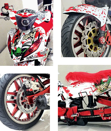 ”Yup, sok belakang aku sentuhi teknologi air suspensions tipe hidrolis,” terang doi. Beralih pada urusan tampang bodi, all set uniform orsi doi lucuti dan doi ganti dengan bodi anyar berparas Jupiter MX. Untuk menarik perhatian, pada bodi anyarnya doi guyur kelir putih dan dibalut cutting stiker 2D bergambar tokoh animasi kartun One Piece.