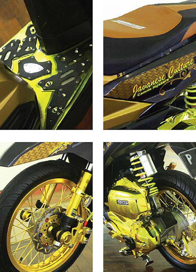 Sebagai aksen, cutting stiker garapan Wandicha Sticker dipasang motif batik yang identik budaya jawa. Sebagai penunjangnya, kaki-kaki ditukar berspoke wheel. Dipasang bertampilan warna emas untuk menunjang konsep mewahnya.