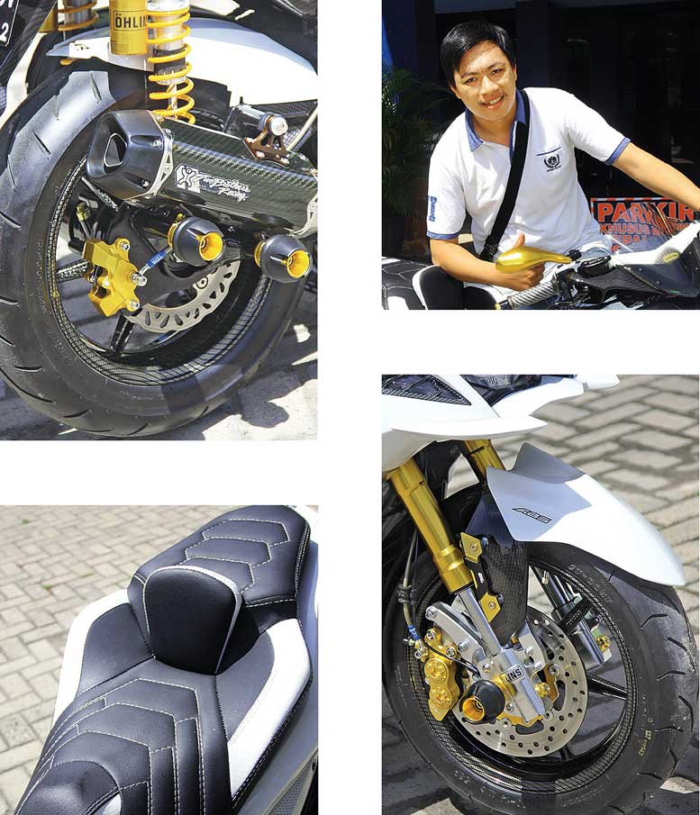 Memaksimalkan aksi, body styling dirambahnya juga. Dengan sedikit mengcustom anjungan muka berwinglet fiber, all lapis permukaan white main body-nya doi balut lapis motif karbon silver berteknik laminasi. Mengimbanginya, sub body juga doi celup karbon berbase coat deep grey.