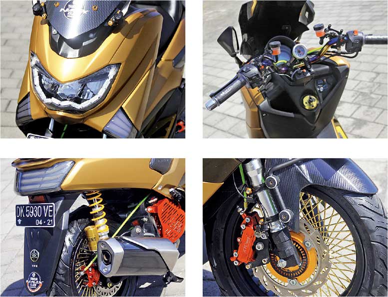 BERSEMANGAT untuk menyempurnakan keelokan sosok premium skutik garputala kebanggaannya, Made Dedy Mahardika meritual ragam aksi modif. Konsep fashion style diolah sedemikian apik, hingga mampu melahirkan kembali sosok N-max sporty, macho berbumbu elegan.