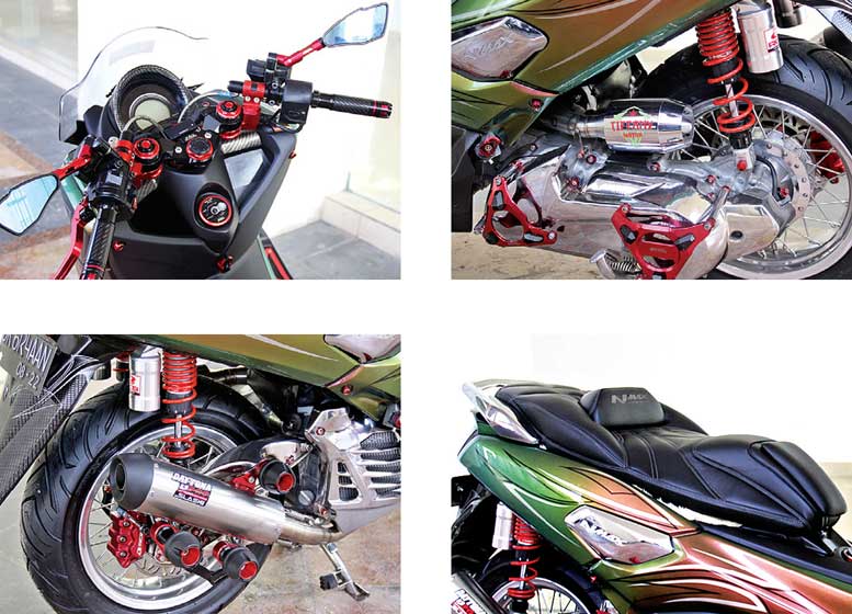 Kali ini doi bangun master piece N Max berhaluan fashion style yang mengunggah aspek estetika berpadu ergonomi. “Tetap mempertahankan originalitas body, tampilan estedenya kugubah elegan bareng semburan base coat bunglon yang lantas kupercantik sentuhan striping grafis berpola pinstrips estetik,” tunjuk Elton yang mendaulat Korax KRX Custom untuk mendalangi proses paintingnya.