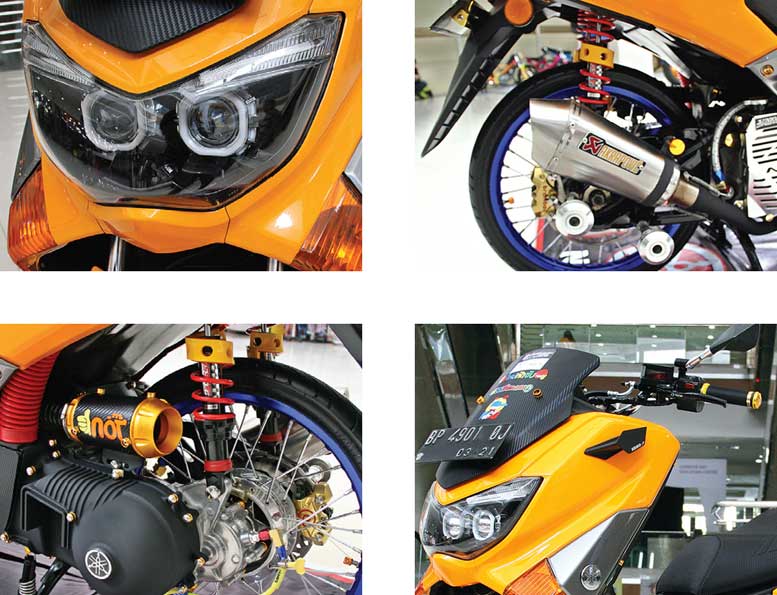 SOK DPN - BLK : Scarlet / YSS DTG Thailand, CAKRAM DPN : TDR, MASTER - KALIPER : RCB, TROMOL : VND, PELEK : VRossi 140-160 ring 17, BAN DPN - BLK ; Comet 60/80 - Mizzle 70/80, KNALPOT : Variasi Akrapovic, LAMPU DPN - BLK ; Dual Projie & custom, EPOXY - CAT & CLEAR : Super Pentagloss - Glasspaint / Autogloss, MODIFIKATOR : Batam Look Style - CP : 0815-3532-0653.