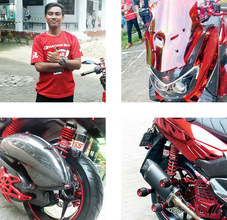 FORK : Nui, DISC : Hell & TDR, MASTER : KTC, KALIPER : RCB, SWING ARM : Zero, SOK BLK : YSS, PELEK : Axio, BAN : Battlax & Pirelli Diablo Scooter, VISOR : Geba, EXHAUST : Remuz, FOOT REST-PEDAL PAD-SETANG : Bikers, FILTER : Ferrox, SPION : Pro Bikers, KROM : Asindo Chrome, Jl.Kamal Muara VII No.18, Jakarta, MODIFIKATOR : MTR SPORT, Jl. Bayangkara No.1A-Makassar (082187502261)