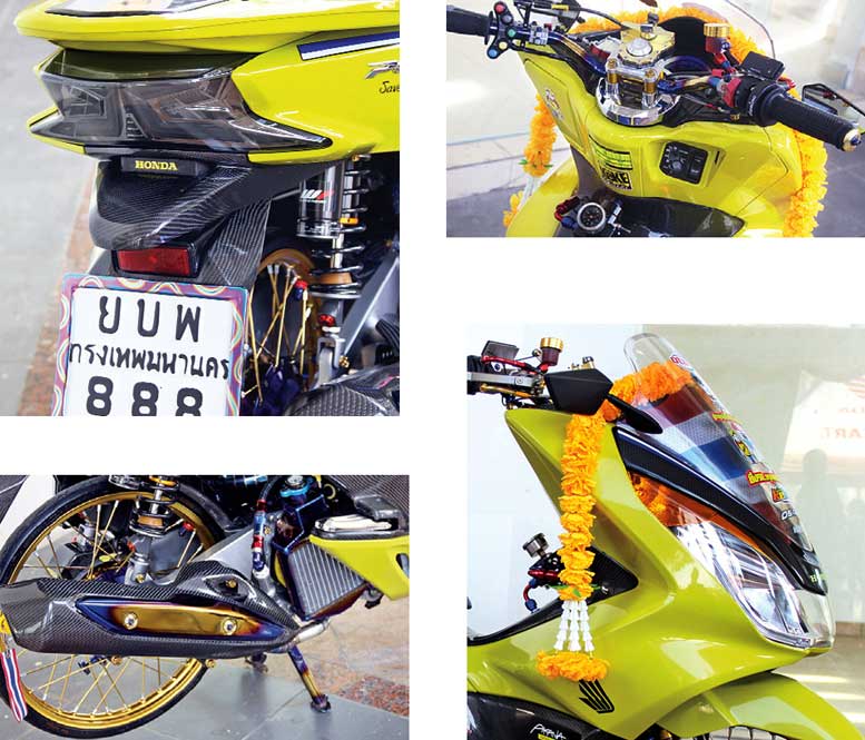 Tetap mempercayakan olah kreasi seninya bareng panji Keke Modified, Agung Keke benar-benar maksi memutar otak kreatifnya. Simak sosok universalnya, tampak kuat bertongkrongan asli skutik premium Honda from gajah putih bareng balutan warna main body lemon, serta sub body kevlar berikut sokongan ragam aseso aftermarket level premium.