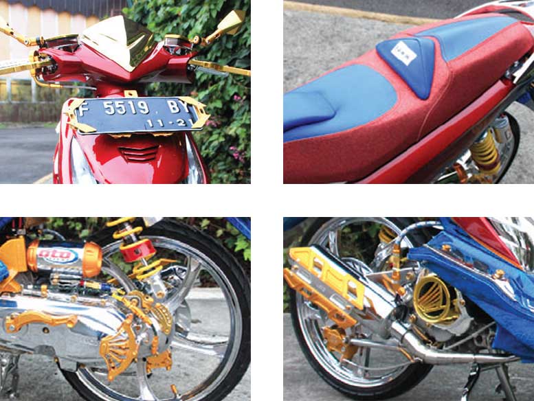HANDLE: Scarlet, MASTER: Scarlet, SPION: Bikers, STABILIZER: Scotts, BAN: FDR & Comet, KALIPER: Brembo & KTC, FILTER UDARA: Mutaru, SOK: Der Racing & YSS, Cover KNALPOT: Motic, CAT: Spieshecker, MODIFIKATOR: DR Repaint & Modified, Jl. Kabandungan 2-Bogor, CP: 08989420264