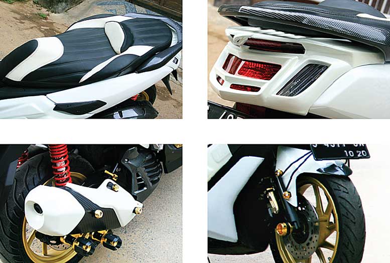 Sosoknya makin elegan dengan jok berbungkus kulit Sintetis MB-Tech warna Hitam dan Putih. Tentu menyesuaikan tema atas warna Dominan Yamaha N-Max terbitan 2015 tersebut.
