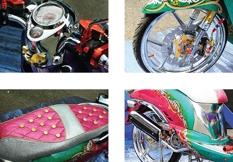 Konsep lebih kinclong dengn penerapan ranah krom plastik . Membungkus sektor dech body, dasi depan dan cover lampu belakang. Tampak total pula pada kaki-kaki Scoopy milik warga Penajam Paser Timur tersebut, dengan memberi full krom pada sepasang pelek Cast Wheel berikut piringan cakramnya.