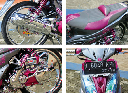 Proses catnya menggunakan bahan Danagloss, begitu juga saat menambahkan motif batik ungu yang lantas difinishing clear Spieshecker. Peremajaan berikutnya dilakukan antara lain menambahkan sticker chameleon di bagian headlamp, serta jok semotif berbahan MB Tech yang membuatnya tampil lebih maksi diikuti handgrip custom berstabilizer Ride It, serta aseso safety riding berupa spion Odys.