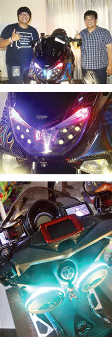 “Tema tattoo burung merak, namun untuk sisi kanan pakai hand paint, sementara itu sisi kirinya berteknik free hand realish airbrush,” paparnya. Roketkan konsep technonya, area setang dan back deck ditanami 3 unit layar LCD dan sepasang speaker aktif tahan air.
