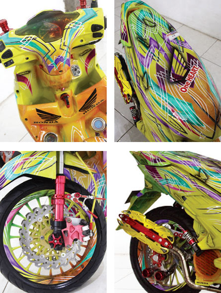 KONSEP : Grafis, DESAIN GRAFIS : Tribal & Pinstrip, CAT : Danagloss, CLEAR : Blinken, BOTTOM : Combiz, MASTER-KALIPER : Nissin, KOVER KALIPER : Bikers, AIRBRUSHER : GAP Modified, Padang Sambian, Denpasar Barat-Bali (085792141179)
