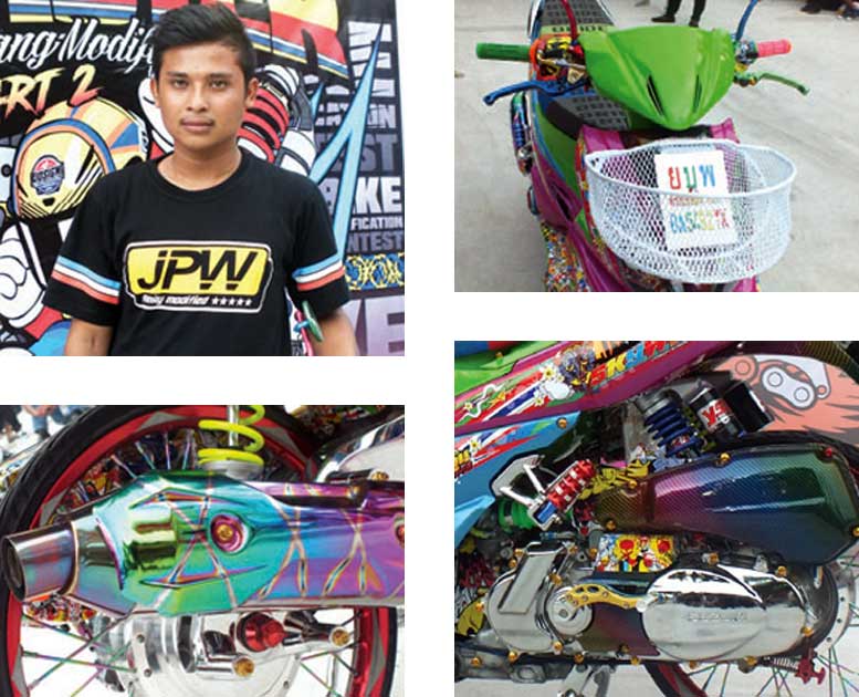 Mesti berani dalam mentandemkan warna hijau, biru dan pink di sekujur bodywork motor yang meriah ditemani hidangan custom sticker bernuansa negeri gajah putih. Demi mengakali bidang kosong lainnya, laminasi bomb sticker ikut menghias bejekan andalan doi, berikut menyematkan sarung Bride pada jok sebagai identitas Thailand, mengikuti variasi keranjang dan juga aseso pengganti part orsi di wilayah kemudinya.