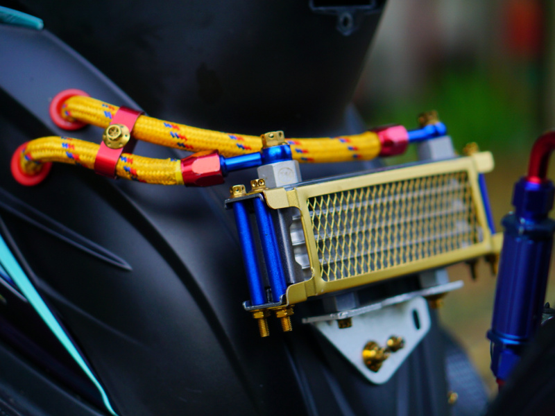 Kombinasi warna dan efeknya pun semakin fit, meski body mungilnya dilapis ulang stripping karya Ranshopp.co yang tetap mengandalkan tema Icon, corak Beat versi Thailand. Yang pasti, tambahan variasi yang serba dua warna, seperti di cover knalpot dan aera luar bagian mesin dan CVT, membuat kesan resik dan cling tadi semakin nyata.