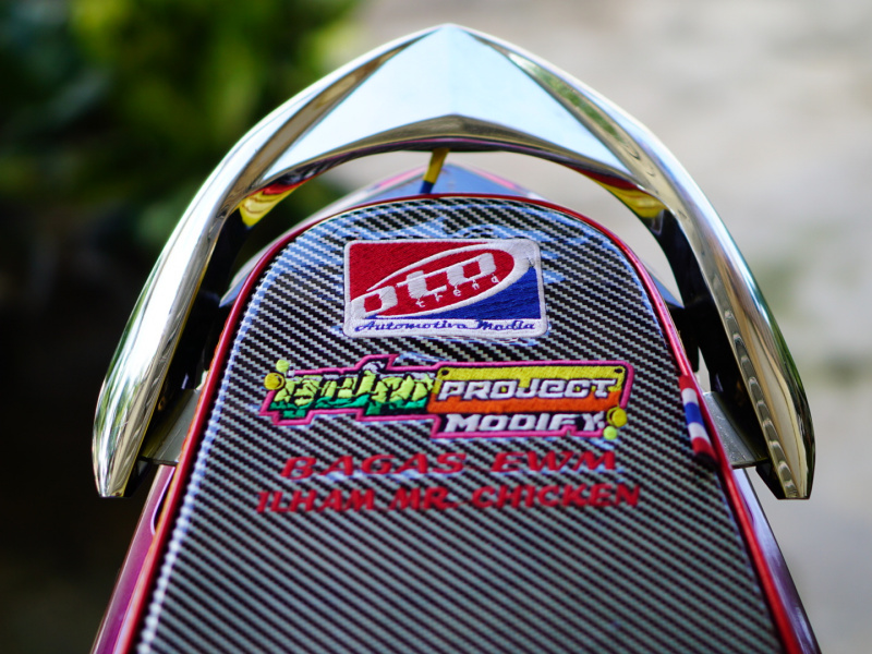 SOK DEPAN : Variasi up side down RT stage, SOK BELAKANG : YSS Gold Series, CAKRAM DEPAN : Gen 260 floating rainbow, MASTER & KALIPER : Brembo RCS19 & Brembo 4 piston, PELEK : Morad, BAN : Duro, SELANG REM : Swits, PIJAKAN KAKI : Non, KNALPOT : Tsukigi, HANDGRIP : Ariete, GAS SPONTAN : Accosato, SPION : Twotone, JOK : Bikers carbon, STABILIZER : Ohlins magnesium & RTC, ASESO LAIN : FPR Aeromotive, SPEEDO : Koso, OIL COOLER : Morin, BEHEL : Malaysia, CVT : Airblade, REMOTE ADJUSTER : Active, CAT & CLEAR : Taibantenk Colour Effect & Sikkens, BRUSHER / TUKANG CAT : C77 Sentul Speedshop - Bogor, STRIPPING : Ransshop.co - Kudus, MODIFIKATOR : EWM Project Modify feat Bagas EW - Tanjung Bintang Lampung Selatan, CP : 0821-2317-0552.