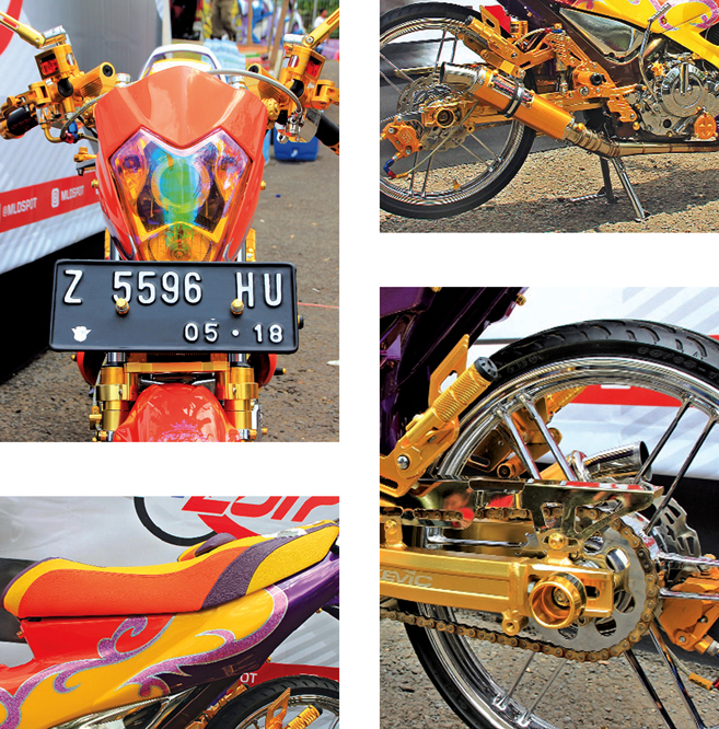 STANG: RCB, HANDGRIP: RCB, HANDLE: KTC, SPION: DER, JOK: MB Tech, PELEK: Variasi, BAN: Duro, SOKBREKER: KTC & RCB, LENGAN AYUN: Delkevic, DISC: KTC, KNALPOT: Daeng, MODIFIKATOR: Tonk Melonk RPM Airbrush, Cineam-Tasikmalaya (085318744903