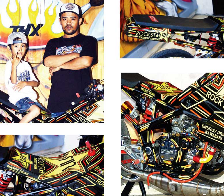 Satu karya perdanya yang ingin tampil di Otre, dengan tetap mempertahankan posisinya sebagai builder berhaluan SR. Ditampilkan pada Kawasaki Ninja 150 KR jahitan pabrik tahun 2009 bertemakan ‘Rock Star Racing’.
