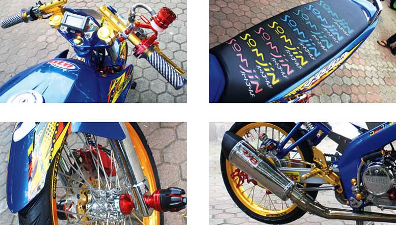 Satu hal paling penting, body jelas dioverspet, yang mana kali ini dipinangnya oplosan warna biru dari Blinken termasuk komposisi vernisnya. Tak ketinggalan, tambahan cutting sticker biar tangki dan bodi nggak melompong.