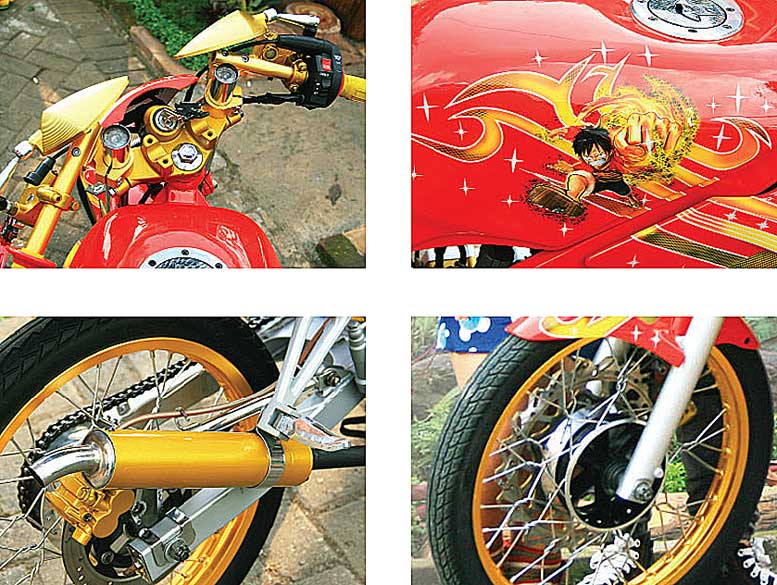 Konsep Es Er harian dipilihnya dan diserahkan pada Abied CPM modif yang juga tetangganya. Mulai dari proses trondolisasi hingga konsep modif pun dikerjakannya. Merujuk kelir merah darah sebagai jujugan yang tampil maksi dengan stiker tema Luffi one Peace modal transfer paper.