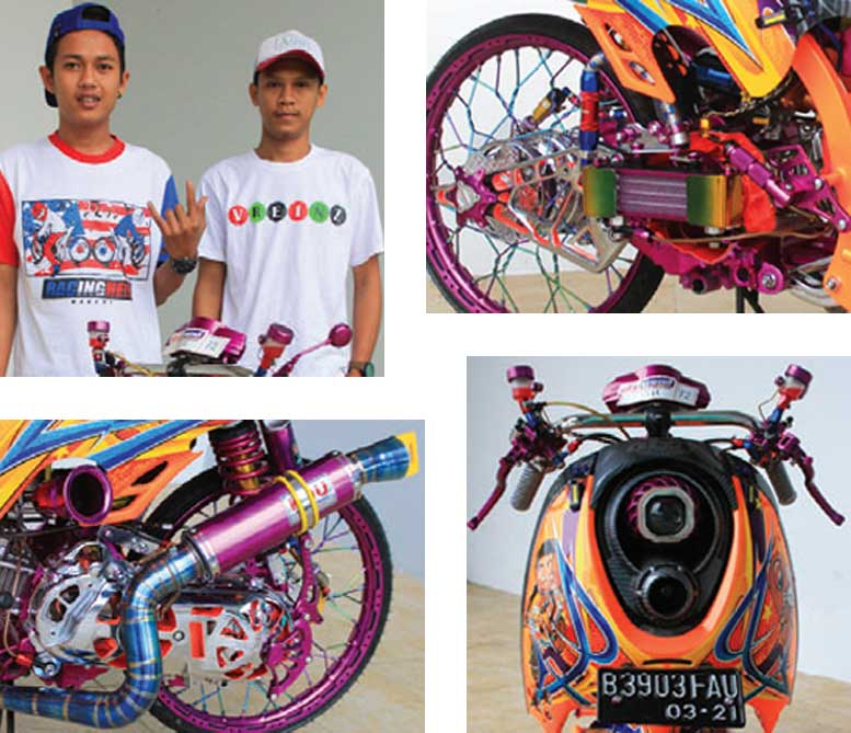 HANDGRIP: Nitex, SPION: Posh, STANG: Pro Drag, HEADLAMP: Proji HANDLE: KTC, STABILIZER: RTC, PELEK: Yoko, BAN: Vee Rubber, SOKBREKER: Combiz & Showa, CAKRAM: Morin, KALIPER: Brembo, SWING ARM: Custom TROMOL: Custom, KNALPOT: KOU, MODIFIKATOR: DRC HK Tentara Langit Jl. Raya MT Haryono (Ruko Rajawali), Setu-Bekasi (082122468989/D4BC6613)