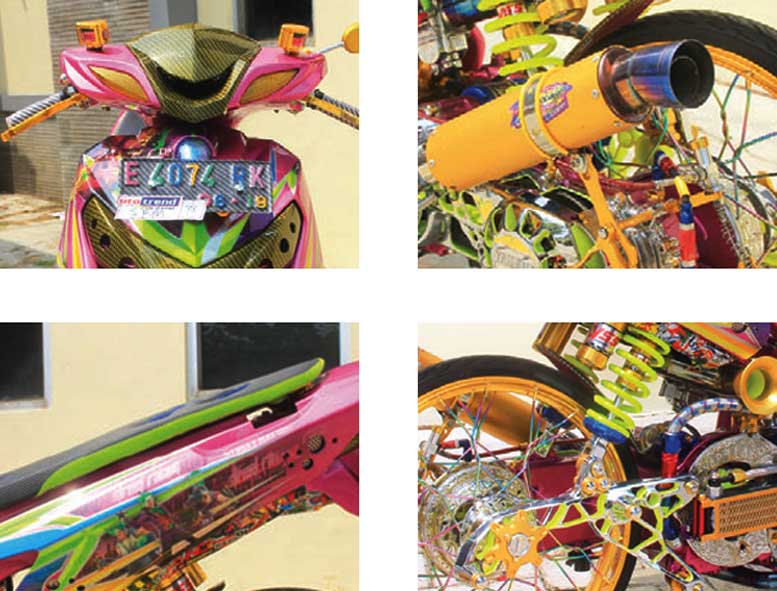 CAT: Blinken, HEADLAMP: Proji, HANDLE: Variasi, HANDGRIP: Nitex, STABILIZER: Scotts, JOK: Custom, OIL COOLER: SPS, PELEK: TK, BAN: IRC, DISC: Brembo, KALIPER: KTC, SOKBREKER: Custom & YSS, SWING ARM: Custom, KNALPOT: Custom, MODIFIKATOR: RMS Feat Ipoell Design Telp. (082211130246)