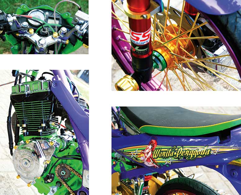 Penunjang lain yakni setelan kaki-kaki cingkrang hasil adaptasi pelek Willwood 140X17 dan 160X17 Ungu. Pasti ditutup dengan ban slim yang dipercayakan pada Primaax sehingga sosoknya terlihat gesit.