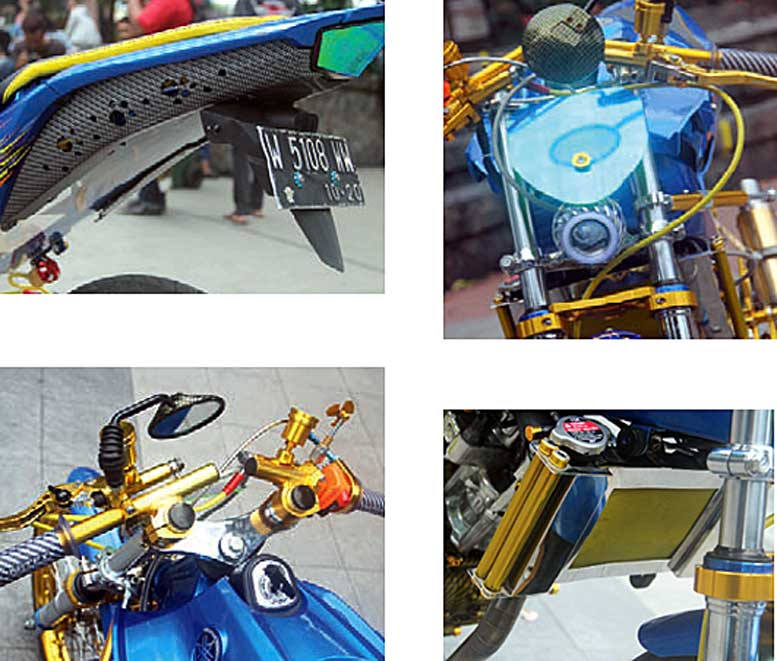 Tak asal mejeng dengan jubah semi trondol, seni keserasian modif serta trend modif turut dimaksimalkan olehnya. Disuguhkan dari kreasinya fresh tongkrongan garputalanya yang diolah rapi jali. “Kelir biru metalic sengaja kukombinasi bareng aseso gold biar tampak matching, dan sebagian part turut kupoles dan krom agar lebih tampak cerah,” tambah Ulumuddin.