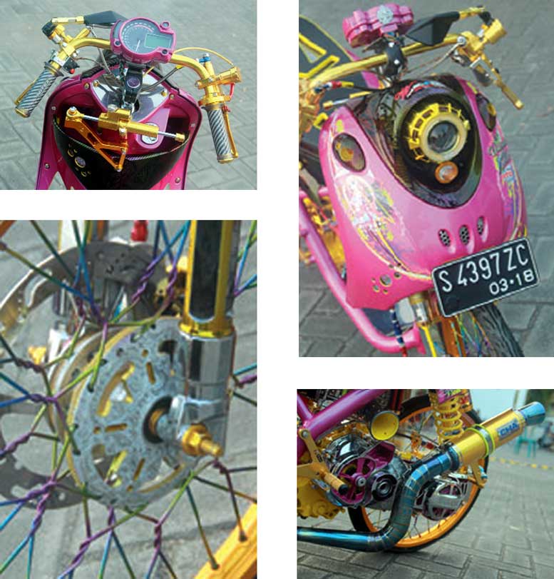 BAN : Yoko 50/90, PELEK : Kingu 110, SOK : Custom & YSS, TROMOL : Custom, CAKRAM : Morin, OILCOOLER : SPS, KNALPOT : CHA, STABILISER : Scarlet, SPEEDO : Koso, MODIFIKATOR :WAC Modified. Jombang. (08573045444)