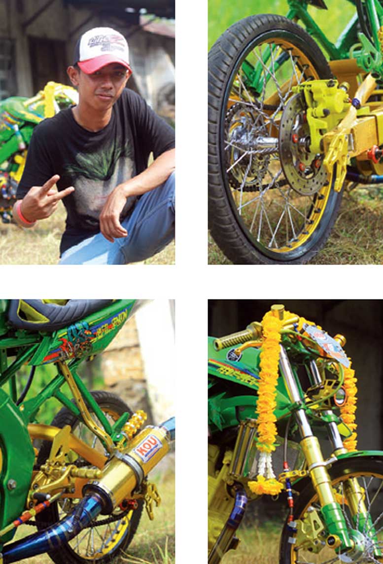 "Kedok depan ganti trondol, tapi masih pasang lampu variasi berikut cover custom plat," tambahnya. Detailing pun dimaksimalkan, seperti finishing bodi serba hijau disaput cut-art untuk tangki dan bodi samping.
