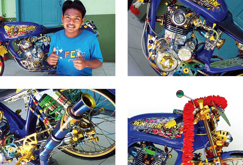 SQUAD MFC Modification asal Pati memang barisan penggila modif super eksis. Dari puluhan motor modif yang digarapnya, GL geberan Setyo ini terbilang andalan di ranah otokontes. Karena itulah, seringkali diubah-ubah sesuai trend terbaru. "Biar selalu eksis nama kita, makanya kalo ada acara kontes, kita selalu berusaha tampilkan motor terbaik," bilangnya.
