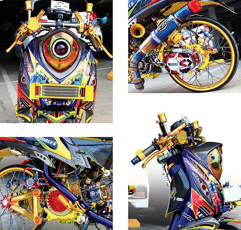 Untuk membuatnya perform angker bercampur trend gres otre style, warna biru pun didapuk via semburan cat Top Colour yang meriah dikombo stripping tribal, berikut animasi joki Moto GP dan laminasi karbon sebagai peyeimbang custom jok tipis, hingga pancangan kemudi tekuk yang sudah dilengkapi variasi handgrip Harris berspidometer Koso.
