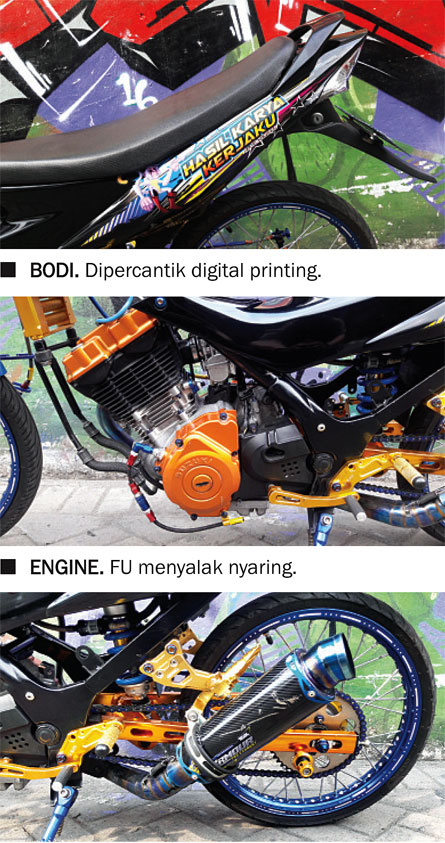 SOK DEPAN : Grafier CNC, SEGITIGA : Aftermarket Thailand, LENGAN AYUN : B Pro, MONOSOK : KTC, CDI : BRT, KARBU : UMA 32 mm, PISTON : Moto-1 (200 cc), CAMSHAFT : Kawahara, KNALPOT : Custom, WORKSHOP : Joyo Speed Motor, Jl. Usman Sadar 83, Gresik (081 3333 641 24).