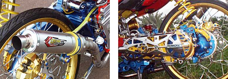 Kemudian menginjak di bagian kaki - kai memang sengaja pakai profil kecil dengan pelek D Max 140 yang di gabungkan dengan ban Duru 50 / 60 serta di pasang tromol custom. Lebih detail lagi di krengkes mesin di kasih warna merah dan biru serta tutup CVT variasi. Almaliki |
