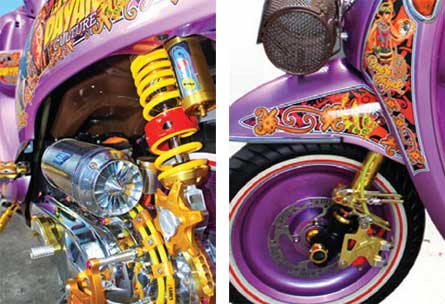 Eksyen bodi kian memikat setelah ku unggah warna ungu candy yang di balut vernis Sikken berefek pink yang terpancar saat diterpa sinar matahari.Tak cukup itu saja, bidang jok kutampilkan dengan warna coklat yang senada dengan warna back rest ala retro style. Tak lupa kakikaki kupercantik dengan menambahkan list ban dipadu pelek monoblog R12 untuk medukung retro style nya.