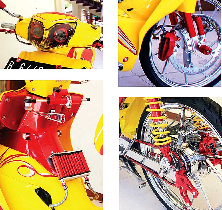 Pemanisnya kagak perlu kelewat nyeleneh, cukup didukung pinstrip simple sebagai identitas kuat fashionable. Selanjutnya, jok perlu dikemas ulang dari bahan MB Tech, diikuti aseso oil cooler, maupun pelengkap wilayah kemudi bareng custom handgrip, stabilizer Scarlet, serta handle KTC berspion aseso demi menemani kedok lampu yang sudah modis dijejali projil and led.