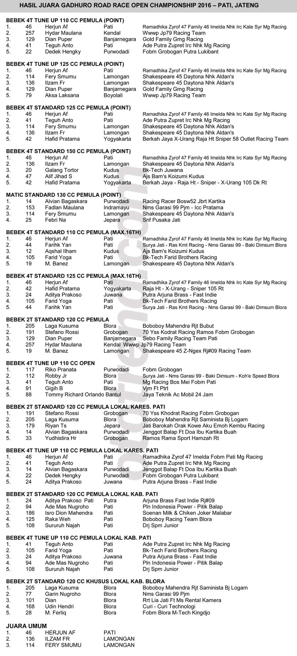 Balap Nasional HASIL JUARA ROAD RACE - PATI, JATENG {jathumbnail off} Artikel Terkait ! 340 Dragster Ramaikan Kejuaraan Pro7 Diesel Attack Experience Drag Race Series I - Kejurprov Jawa Timur 2025 di Surabaya