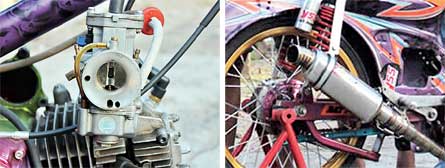Doping tenaganya dilayani karbu Kawahara 28 mm, disetting dengan main jet 132 dan pilot jet 50. Dilanjutkan pemakaian katup aftermarket, berdiameter 28 mm (in) dan 23 mm (ex), bersanding knalpot Creampie. Konteks meningkatnya debit gas segar di ruang bakar ini juga merujuk Erik, mendongkrak perbandingan kompresi menjadi 13,5 : 1.